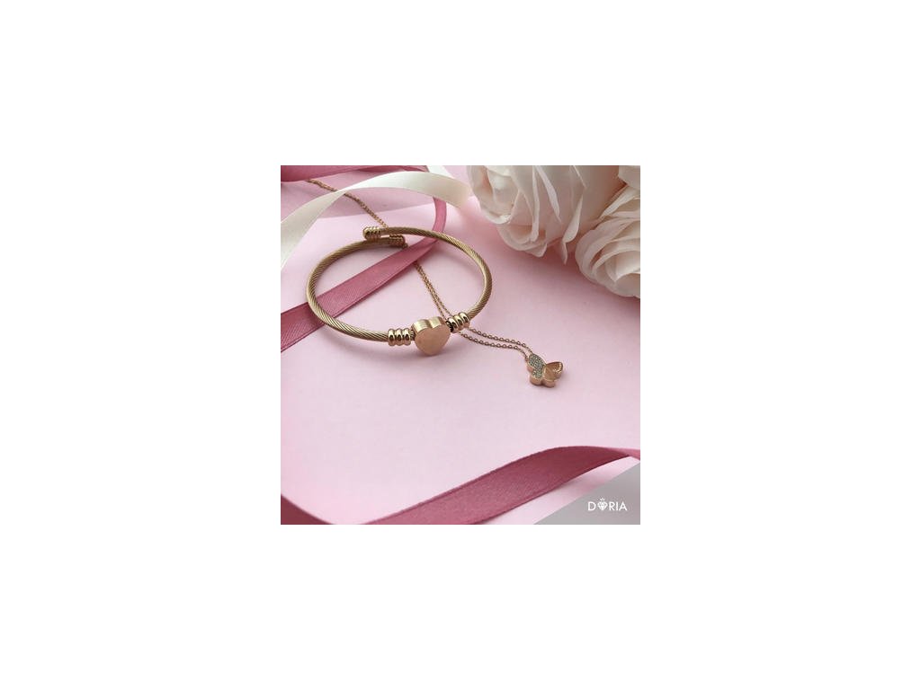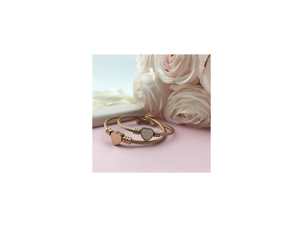 Pevný náramek se srdíčkem z lanka z chirurgické oceli v barvě růžové zlato, průměr: 65 mm, šířka: 3,4 mm. Velikost náramku se přizpůsobí obvodu ruky díky materiálu, ze kterého je vyroben.