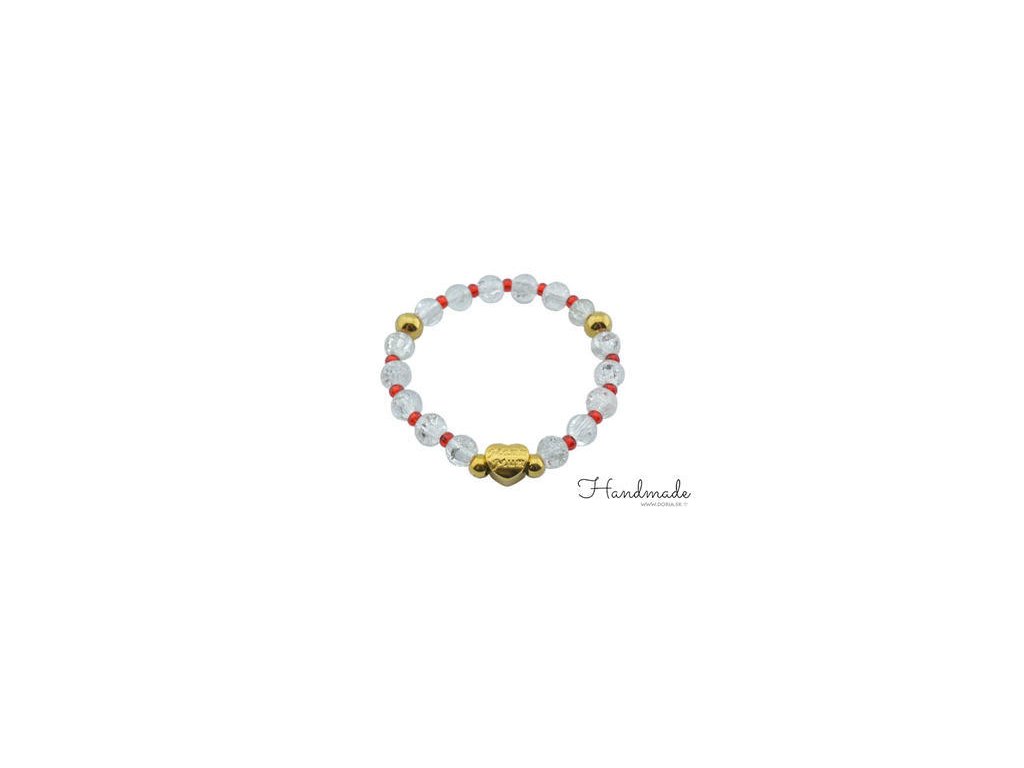 Barevná kombinace: čirá / červená / zlatá. Náramek je navlečen na elastickém vlákně. Náramky vyrábíme v univerzální velikosti s délkou 180 mm (vyhovuje na zápěstí s obvodem 160 mm).
