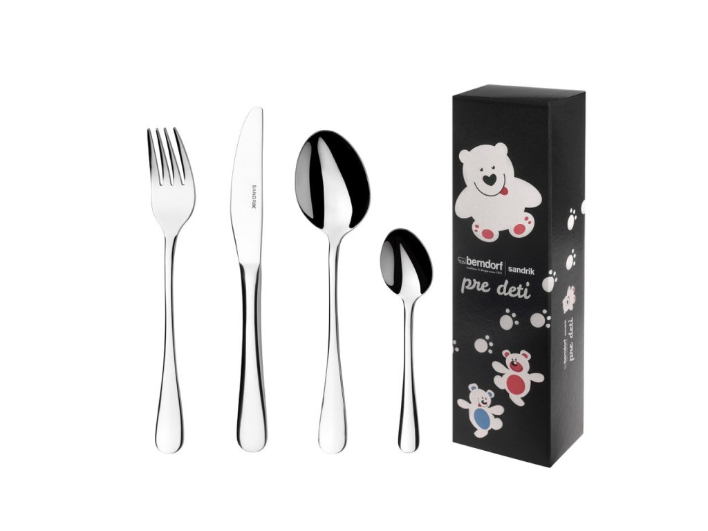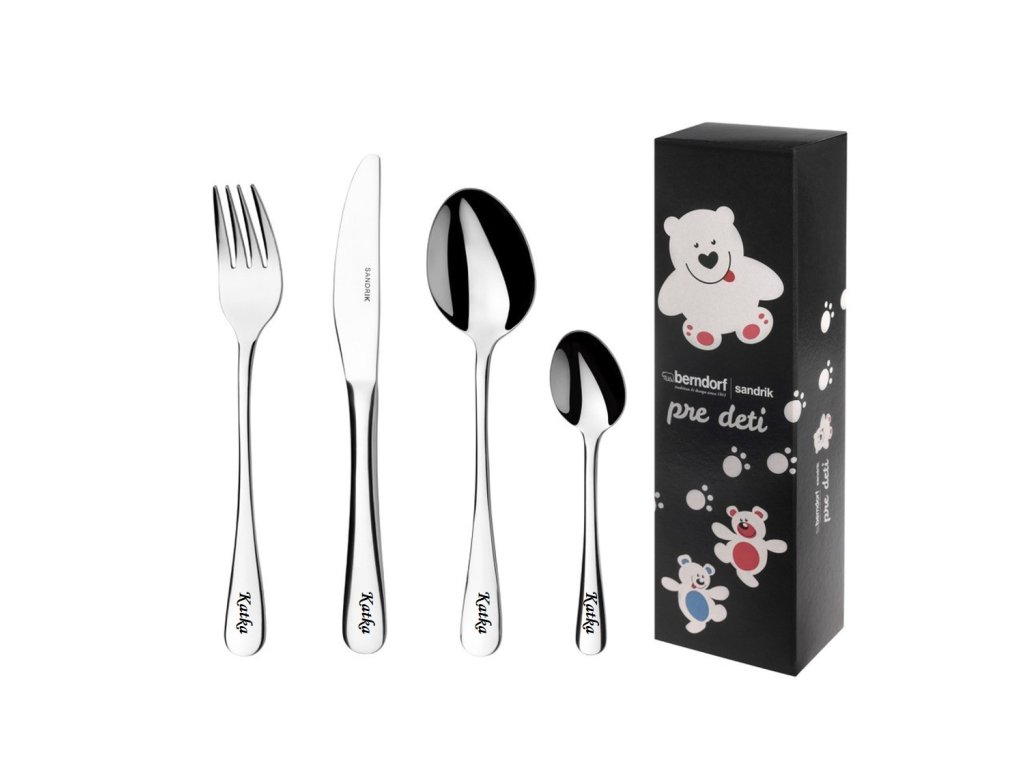 Dětský příbor BERNDORF s možností gravírování jména nebo textu. Tato 4-dílná dětská souprava vyrobená z nerezavějící oceli obsahuje dětskou lžíci, vidličku, nůž a čajovou lžičku. Dětský příbor Berndorf Sandrik může být krásným užitečným dárkem pro každé dítě. Příbor je velikostně vhodný pro děti starší 4 let.